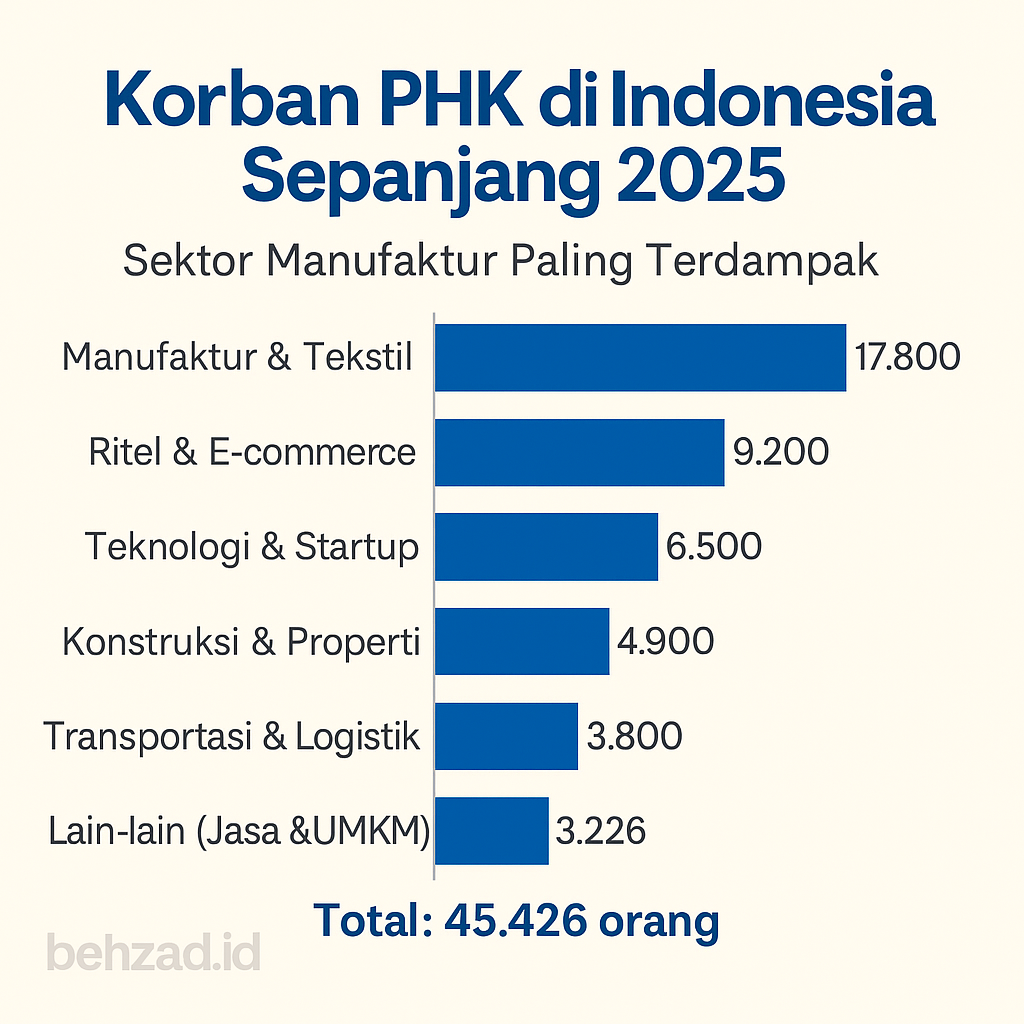Sektor Industri Jumlah Korban PHK Manufaktur & Tekstil 17.800 orang Ritel & E-commerce 9.200 orang Teknologi & Startup 6.500 orang Konstruksi & Properti 4.900 orang Transportasi & Logistik 3.800 orang Lain-lain (Jasa & UMKM) 3.226 orang