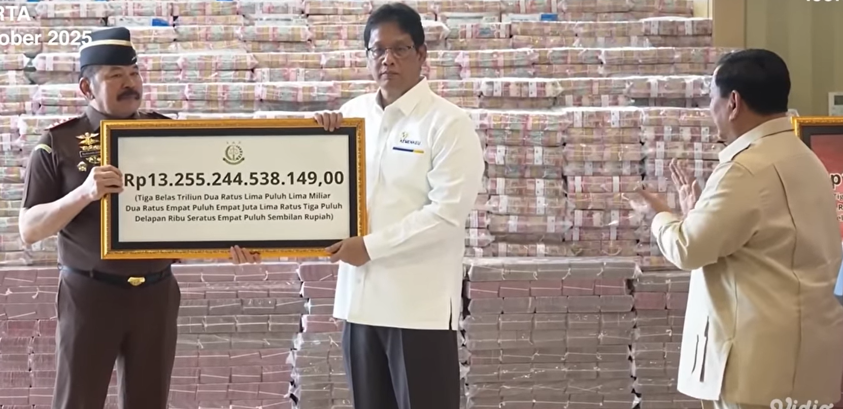 Acara berlangsung di Gedung Utama Kejaksaan Agung RI, Jakarta, pada Senin (20/10). Terlihat Presiden Prabowo bersama Menteri Pertahanan Sjafrie Sjamsoeddin dan Jaksa Agung ST Burhanuddin berjalan menuju tumpukan uang yang disusun sebagai simbol pemulihan kerugian negara.