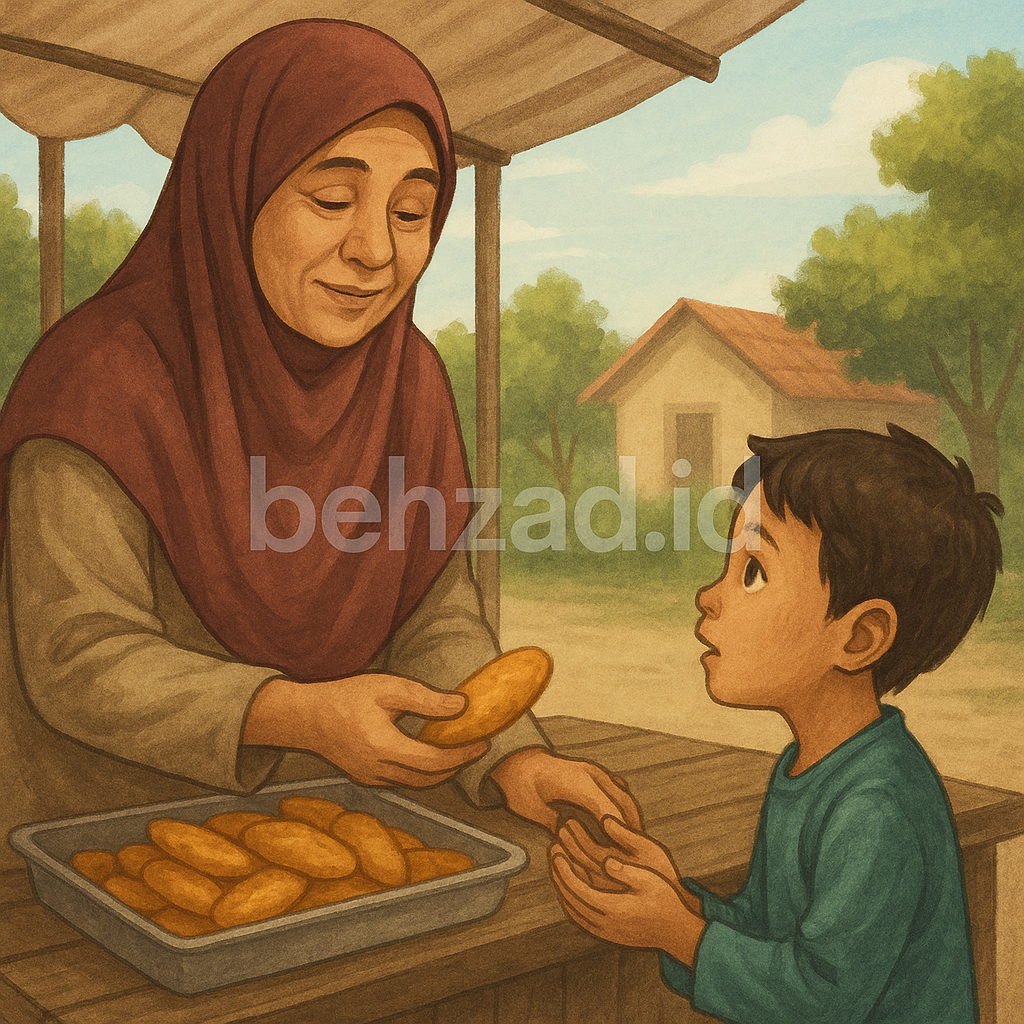 Rahma menatap anak itu. Hatinya bergetar. Ia tahu dagangannya belum laku, tapi tangannya ringan memberikan dua potong gorengan kepada si anak. “Makanlah, Nak. Semoga Allah cukupkan rezeki kita hari ini,” ucapnya lembut.